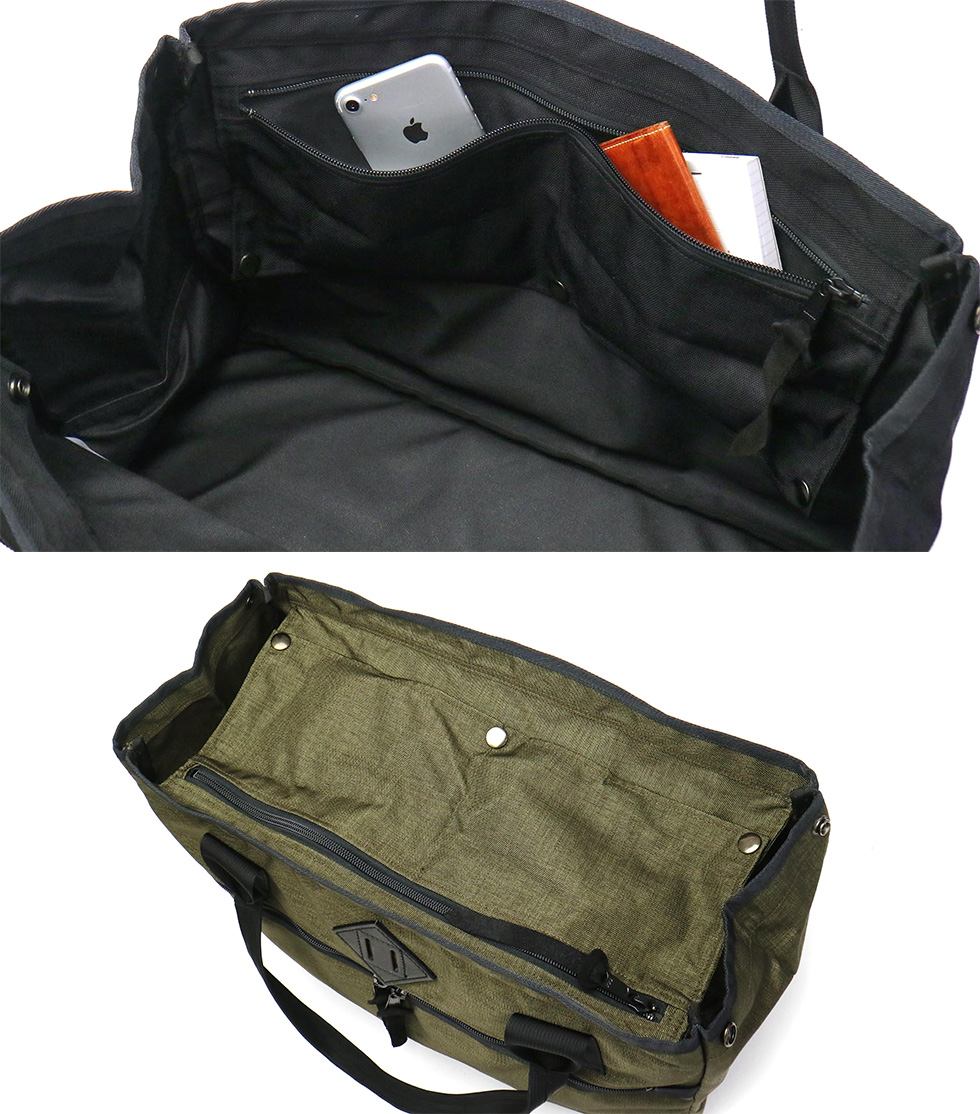With a zip pocket with a partition on the inside, it is possible to put the baggage in a subdivision. In addition, this pocket can be used as a top cover of the bag, and it also has a function to prevent the jumping out of the baggage.