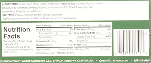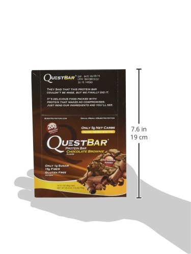 -. Binding : Health and Beauty -. Brand : Quest Nutrition -. Feature : If you're a chocoholic, you'll love chocolate brownie quest bars / Now you can get that amazing taste in an all natural, high protein (20 gram) bar with none of the guilt / Sweetened with stevia and erythritol / Only 5g net carbs; from nuts, not sugar / The only true low carb bar on the market -. IsAdultProduct : 0 -. Label : Quest Nutrition -. Manufacturer : Quest Nutrition -. ProductGroup : Grocery -. ProductTypeName : HEALTH_PERSONAL_CARE -. Publisher : Quest Nutrition -. Studio : Quest Nutrition -. Title : Quest Bar Protein Bar, 2.11 Ounce (Pack of 12)