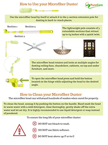 -. Title : Pure Care Microfiber Duster with Extension Pole, Flexible, Bendable, Washable, Lint Free, Hypoallergenic Large Microfiber Head, Includes Lightweight Telescopic Pole, Saves Time & Money, Light Green