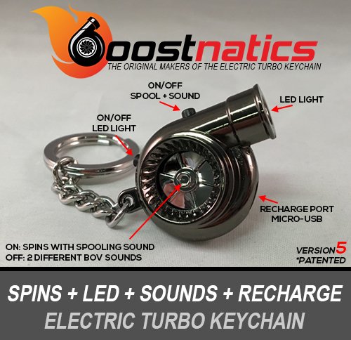 -. Feature : BoostnaticsTM Electric Turbo Keychain Version 5. Black finish. / No air blowing required. Push the ON/OFF button to start Boosting! / When ON button is held, will emit a turbo spool up sound. When button is released (OFF), will emit 1 of 2 blow off valve sounds. / Powerful night time LED light / Made from high quality Zinc Alloy. Rechargeable via USB (Cord Included).