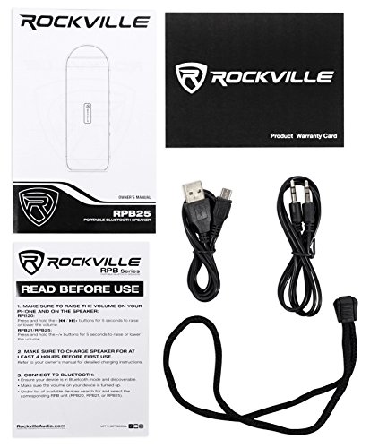 -. Binding : Electronics -. Brand : Rockville -. Color : Black -. EAN : 0811080028514 -. Feature : Includes: RPB25 Bluetooth Speaker. 3.5MM MP3 Cable. Micro USB Charging Cable. String for hanging. User Manual. Warranty Card. / Rockville RPB25 40 Watt Portable/Outdoor Bluetooth Speaker w/USB+SD+Aux In+FM . 40 watts peak power. 15 watts continuous RMS. 360-degree sound dispersion technology. True 2 channel stereo sound delivers top-notch sound quality. Battery charges with included USB cable. 3.7V / 2000 mAH battery supports 10 hours of playback at 70 % volume. Charge time: 2.5 Hours. Extremely loud and powerful with industry-leading bass! Bluetooth version. 2.1 with EDR (enhanced data rate). / Bluetooth quick-connect technology pairs with your phone in 5 seconds. A2DP audio streaming with 32 foot max Bluetooth range. Automatically remembers and syncs with previously synced devices. Playback Controls - Play, Pause, Skip Forward, Skip Back, Volume Up, Volume Down. Will control next song, pause, play on popular apps like , Spotify, Youtube, and others. The built-in mic allows you to speak through the device so you can make and receive phone calls hands-free. / Compatible with any Bluetooth devices such as iPad, iPhone, Laptops, Android phone, other cell phones, iPods, other Bluetooth MP3 Players. Material: ABS, Rubber + metal grille. Input power Input: DC5V/500mA. Plays back SD cards up to 32 GB. Plays USB thumb drives up to 32gB. 3.5MM aux input (aux cable included). Built in FM radio with auto scan. Dual 2" inch drivers with 42 gram magnet, rubber surrounds, and high excursion. Handle enables you to carry the speaker easily. / No distortion can be heard even at top volume . Distortion: Less than 1 %. Professional voice conformations. Frequency Response: 50HZ - 20KHZ. Signal to noise ratio: 85dB. Unit weight: 0.84 pounds. Dimensions of Unit (inches): 2.76" L x 2.68" W x 7.76" H . Shipping Weight: 1.52 pounds. Shipping Dimensions (inches): 10" x 4.96" x 4.06" . 90 Day Money back guarantee! -. IsEligibleForTradeIn : 1 -. Label : Rockville -. Manufacturer : Rockville -. Model : RPB25 -. MPN : RPB25 -. NumberOfItems : 1 -. PackageQuantity : 1 -. PartNumber : RPB25 -. ProductGroup : CE -. ProductTypeName : PORTABLE_AUDIO -. Publisher : Rockville -. Size : Small -. Studio : Rockville -. Title : Rockville RPB25 40 Watt Portable/Outdoor Bluetooth Speaker w/USB+SD+Aux In+FM -. UPC : 811080028514