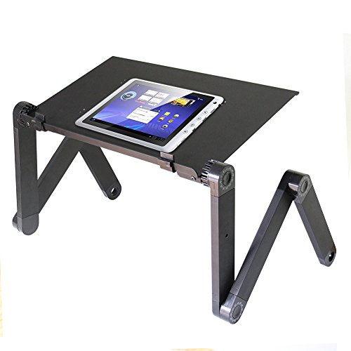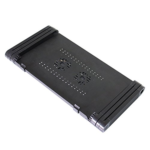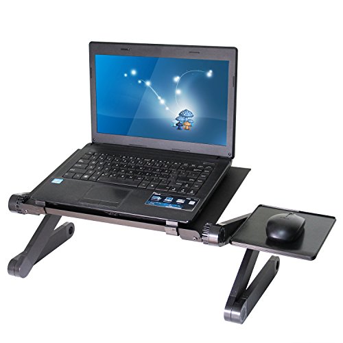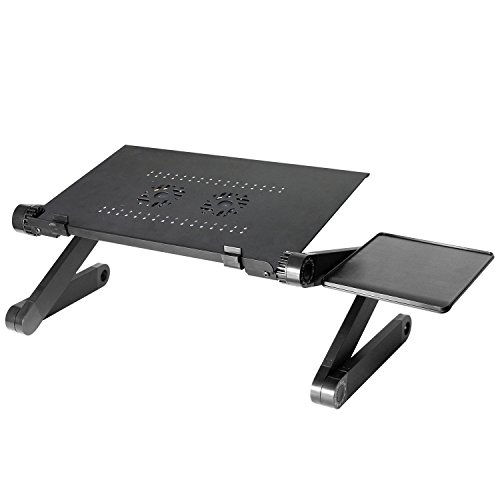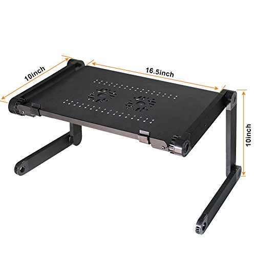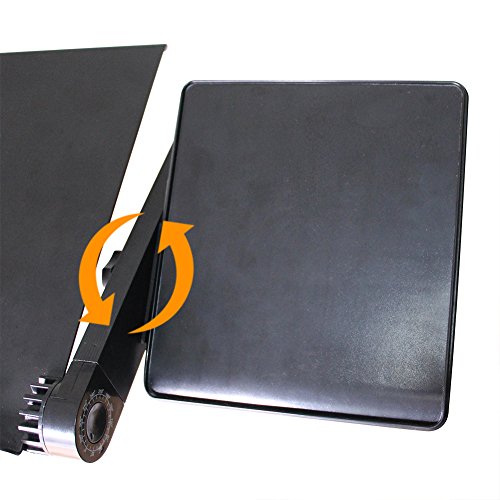 -. Feature : Wide Use and multifunctional, It can be used as laptop table, Dinner tray, Book Tray, Sketchpad, Writing Desk, Tablet Holder Stand Up Desk, Gaming Table, Notebook Stand, keyboard Lift, Laptop Tray, Keyboard Riser, Foldable Laptop Desk, Cooling Pad, Computer Stands for Laptop, Adjustable Pedestal Fan, Folding Tray Table, Standing Desk Converter, Laptop Base, Ergonomic Laptop Riser, Desk Raiser, Laptop Cart, Laptop Holder, etc / Aluminum Alloy Material, excellent heat dissipation design. The laptop holder is made from Aluminum Alloy, which has nicer heat dissipation for the material itself. Besides, there are lots of small heat emission holes on the pad that cool down the heat quicker / Quite built-in USB cooling fans. There are 2pcs CPU Cooling Fans on the table, connect the USB cord to your laptop to operate it / Rotate 360 Degrees - It has 360 degree rotations and can be locked at various angles. Very easy to adjust, push the Button and Rotate the Leg. No assembly is needed / Package include: 1 x Adjustable Tray Table, 1 x Mouse Pad