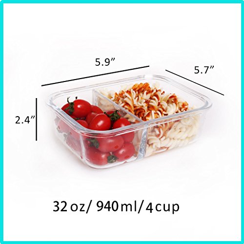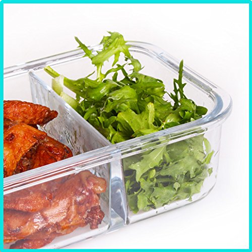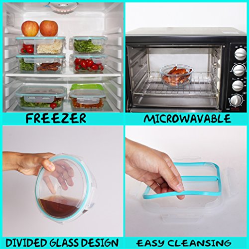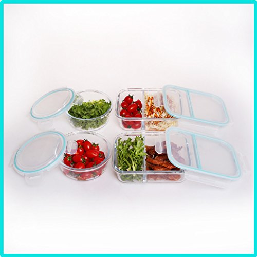 FOUR PIECE SET - Includes 2 rectangle 2 compartments container(32oz) with 2 snap locking lids plus 2 circular container(22 oz) with 2 snap locking lids