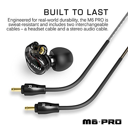 With a durable, comfortable design and great sound, the MEE audio (formerly MEElectronics) M6 PRO In-Ear Monitors are an all-in-one audio solution for gym, stage, and street. Flexible over-the-ear memory wire and seven pairs of eartips provide a secure, personalized fit for all ears. An ultrathin 5µm driver diaphragm and aluminum voice coil deliver clear, full-range sound with deep, yet balanced bass and crisp detail reproduction. Engineered for real-world reliability, the M6 PRO features detachable, user-replaceable cables and sweat resistance. ComplyTM memory foam eartips reduce external noise, enabling safer listening volumes.Feature