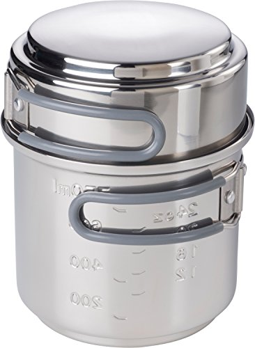 Studio : Industrial Revolution Publisher : Industrial Revolution Binding : Sports Product Description The Esbit CS985ST Alcohol Stove Trekking Cook set provides various options for cooking out on the trail. It has a 985 ml pot with a volume indicator in ml/oz. increments on the side, and a 470 ml pot/pan which also serves as a lid. Constructed from Stainless Steel, the set includes a stand that supports the pots, and includes a solid brass alcohol burner. The alcohol burner is constructed from brass and allows variable temperature control, plus it holds the denatured alcohol in it during transport. Everything can be stored and carried in the large pot, which comes with a mesh bag, and fits compactly in your backpack. Dimensions-packed: 5.8" x 5" (14.7 cm x 12.8 cm);Weight: 19 oz. (530 g); Capacity: 33 oz. (985 ml). 0