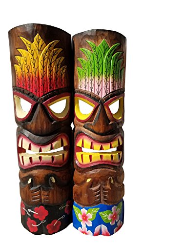 Set of Two Wooden Handcarved 20" Tall Tiki Masks Hawaiian Beach Style with Flower Shorts!!