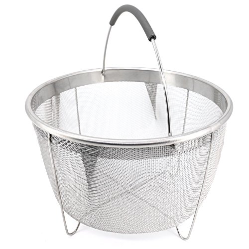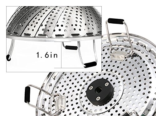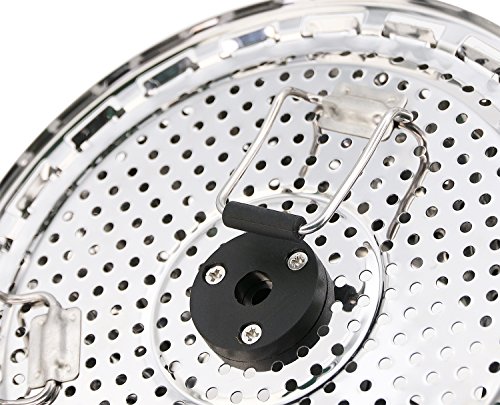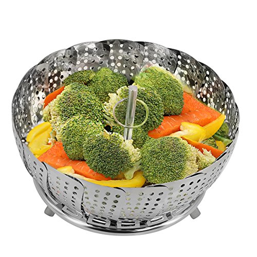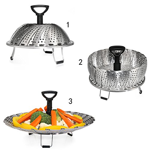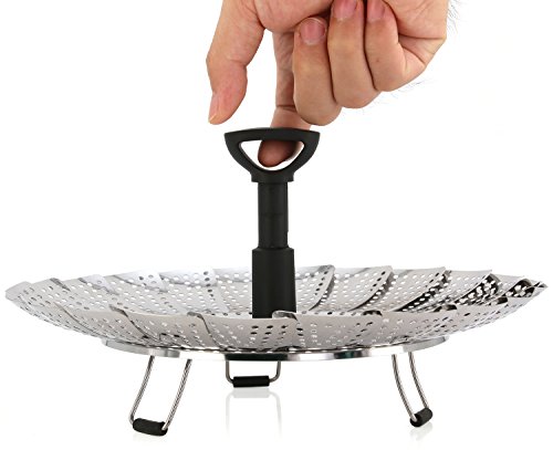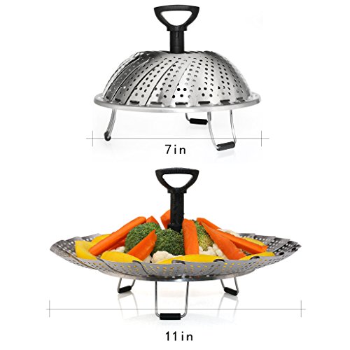 Perfect combination stainless steel metal basket comes complete as a steamer and strainer. Already assembled one piece combination. Collapsible - it goes from small to large 9" in a snap when petals are opened and comes with a convenient handle inside. Easy to use - raw or frozen bags: mixed vegetables, Normandy, Italian or California blends. Try fish: cod, salmon, talapia, etc. 2" Handle with O-ring - easy lifting and strain excess water - avoid spring loaded extendable handle popping off your pot lid while cooking. Have you been searching, how to use a vegetable steamer or vegetable steamer instructions? If so, here are some steps to help you use steamer: 1st - wash before use! 2nd - open the steamer and place raw or frozen vegetables inside. 3Rd - close the steamer and place in a pan or pot with just enough water to fill to where the base of the steamer is above the water level. 4Th - cover for a few minutes, timing is dependent on what you're cooking, how muchand frozen or raw. Raw thin vegetables will definitely cook faster. Use a fork to check for tenderness. 5Th - use handle to lift and strain excess water while removing, seasonand enjoy. Make sure you don't boil dry. You can listen for when the water has evaporated. If you're making baby food, you would transition your soft vegetables to some type of blender, where they could be quickly mashed for baby food. You can also manually mash them since they will be soft and tender. Clean up is a breeze. Although dishwasher safe, to preserve the quality of the steamer, it is best to hand wash and air or towel dry before storage. The compact design allows for easy storage without taking up tons of space. Gift perfect wedding present, showers, housewarming or a cook enthusiast. Buy now or add to cart.Feature