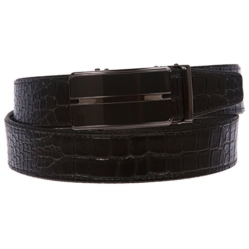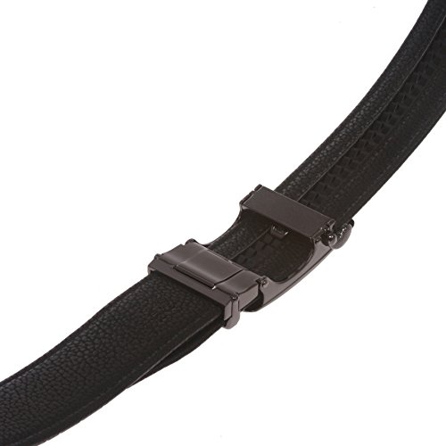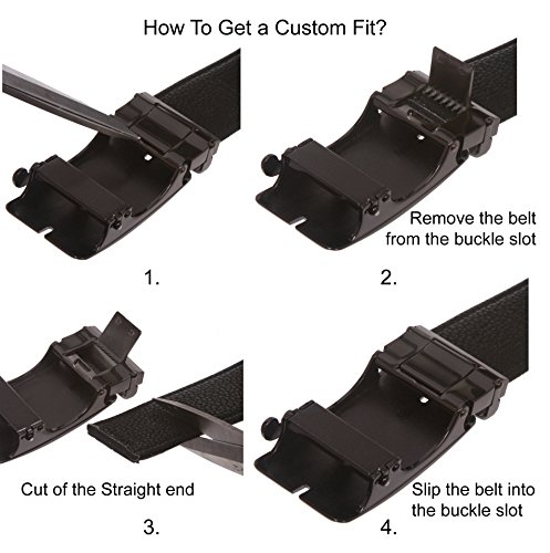No holes ratchet belt means you can precisely adjust your belt to the perfect fit. Our easy to use buckle makes adjusting your belt effortless and it can be easily interchanged with different straps. Our distinctive buckle and our high quality genuine leather provide the finishing touch to your outfit. This belt comes with 4 different waist size options to minimize your DIY work. -Perfect fit: For an absolute great fit just follow these two simple steps: -- 1. To loosen belt from buckle- firmly push the belt forward inner way in buckle and closure will lift on its own. (No tools needed!) -- 2. Cut the belt to your desired size and secure it firmly with closure. You're no longer restricted to 1 inch size adjustments, but can get a perfect, superb, and custom-fit all the time!Feature