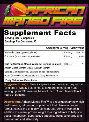 The top choice for adults who are serious about losing weight and getting rid of unwanted body fat. African Mango Fire is a revolutionary high performance, fat burning supplement that utilizes a unique formula of highly concentrated African Mango in addition to several proven weight loss ingredients allowing you to burn fat quickly and effectively.African Mango Fire's powerful all-natural formula is designed to promote weight loss from all directions by raising metabolism, burning more fat, suppressing appetite and increasing energy levels. Giving you one of the most advanced and effective weight loss solutions available that provides maximum results without the risky ingredients and dangerous side effects found in pharmaceutical diet pills. African Mango Fire is the only African mango formula with ingredients that address all the factors of safe and effective weight loss to help you shed pounds quickly.