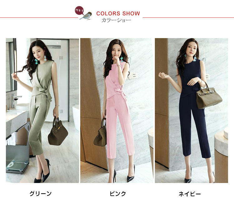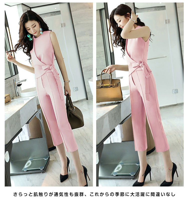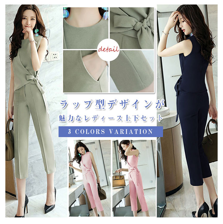 | ラップ型デザインが魅力なレディース上下セットウェストリボンが大人エレガントを演出し、チャームpointクロップドパンツにはピンタックを寄せられ、足長効果抜群デートやオフィスは勿論、入卒式やお呼ばれなどもお勧め◎さらっと肌触りが通気性も抜群、これからの季節に大活躍に間違いなしサイズ展開はMから3Lまで揃えたので体型にあったものをお選び頂けるのも嬉しい | |