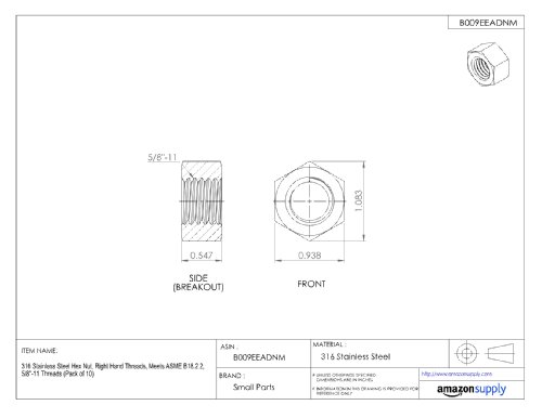 316 Stainless Steel Hex Nut, Plain Finish, ASME B18.2.2, 5/8"-11 Thread Size, 15/16" Width Across Flats, 35/64" Thick (Pack of 10)