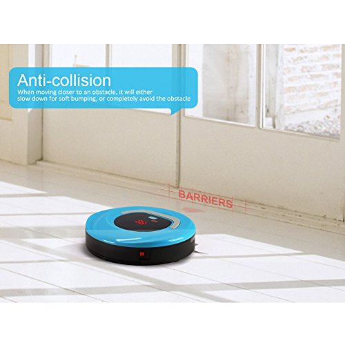 INTELLIGENT ANTI-COLLISION: The robotic cleaner comes with an anti-collision light sensor, effectively avoid the body damaged because of colliding to the wall or furniture , when it close to the wall/furniture 3-5cm it'll stop moving forward. Automatically avoid obstacles, while the battery is low, the vacuum robot won't hide under the furniture to avoid can not find it when it's lack of electricity