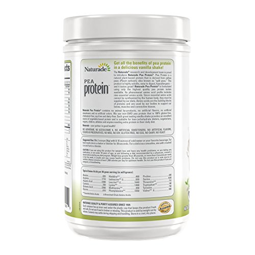 • Naturade Pea Protein is all natural and contains no animal by-products, no artificial flavors, no artificial sweeteners and no artificial colors. We use non-GMO pea protein that is 100% gluten-free, cholesterol-free, soy-free and dairy-free. Each great tasting vanilla shake provides an excellent source of vegetable-based protein and is suitable for low-carbohydrate dieters, vegetarians, vegans, children, athletes and anyone needing extra protein in their daily diet.