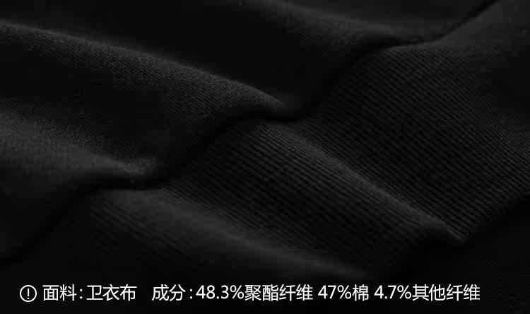 | 面 料:主布:48.3%聚酯纤维47%棉4.7%其他纤维 帽里: 棉 罗纹:97.9%棉 2.1%氨纶颜 色:黑色 |
