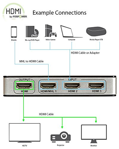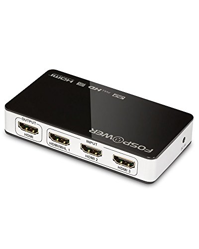 FosPower HDMI+MHL switch has three HDMI input sources to project to one display. It also has a source select button on the switch and a remote control to provide flexibility for you to manually switch between three sources.