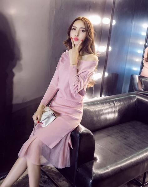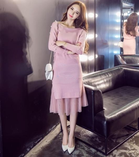 レイヤード風 パールビジュー ニット セットアップ ミモレ丈
