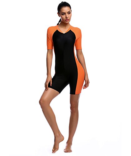 One Piece Swimsuit for Women Belloo Short-sleeve Surfing Suit Sun Protection, Orange, Large