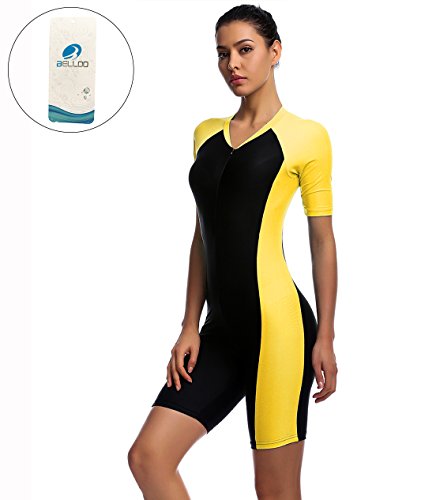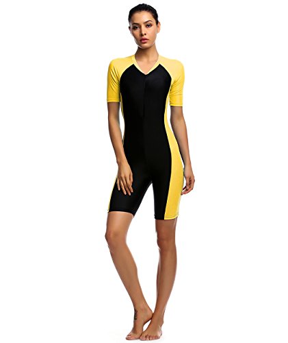 One Piece Swimsuit for Woman Belloo Short-sleeve Surfing Suit Sun Protection, Yellow, X-Large