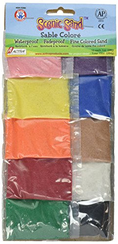Scenic Sand is fun, fascinating and easy to work with. It comes in an assorted pack, with 10 different vivid, non-toxic permanent colors that are ACMI approved. Each color pack is 1 oz., easy to handle and so much fun. The assortment includes; Deep Black, White, Pink, Vivid Green, Cocoa Brown, Light Green, Orange, Turquoise, Dark Blue, bright Yellow, Bright Red and Purple. Paint with sand- create colorful sand paintings, sand mosaics and projects for home décor and gifting. Add that extra decorative dimension and texture to paper Mache, jewelry, baskets, wood cut outs, boxes and plaques. Scenic Sand has a full range of beautiful rich colors that give you limitless design possibilities.Feature