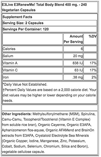 -. Feature : Enhance the power of E3Live with E3 Renew Me! Total Body Blend / a superfood green blend. / E3live has blended E3AFA and E3 BrainON (which contains PEA / coined as the molecule of love / this provides emotional uplift and mental alertness for your mind). / E3RenewMe! Total Body Blend is a new formula that also includes a food-based Vitamin E complex for a smoother taste and overall increased benefits. / E3 RenewMe! contains a proP.R.Ietary blend of nutritional plant-derived MSM (methyl sulfonyl methane) / spirulina / E3AFA / certified organic cayenne pepper / wild-crafted South American camu-camu / E3 BrainON / tocotrienol tocopherol (Vitamin E complex) / and cr / Contains a blend of superfoods that are shown to: Promote mental alertness and emotional uplift Boost the immune system and help your body eliminate toxins Exhibit anti-inflammatory properties.