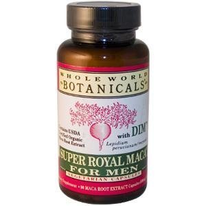 Whole World Botanicals Super Royal Maca For Men 500 mg 90 Veggie Caps Description Contains USDA Certified Organic Maca Root Extract With DIM Lepidium Peruvianum/Meyenii Vegetarian Capsules A Dietary Supplement Maca Root Extract Capsules Research suggests that the use of DIM, contained in this product may lower your risk for BPH and prostate cancer. Royal Maca is prepared by a proprietary process making it a more concentrated & potent maca root powder. Suggested Use Take 1 cap with meals 2-3 times a day. If stronger effect is desired, you may take with regular Royal Maca. Other Ingredients (Capsules): Cellulose, purified water. Contains organic maca root. Gluten-free. Not irradiated. Contains no additives or fillers. Warnings Keep out of the reach of children. Consult a health care practitioner before using this product if you have prostate cancer. Note: It is normal for urine to appear more orange while using this product. Store in a cool, dry place. Do not refrigerate.Feature