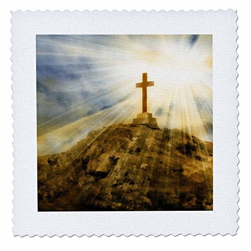 3D Rose Gold Cross on the Top of a Hill with Sun Rays for a Spiritual Feel Quilt, 10 x 10"