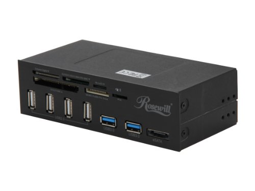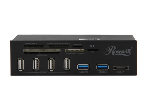 The Rosewill RCR-IM5001 Card Reader is designed to install neatly into a 5.25" drive bay on your desktop to give you convenient access. This six-slot reader accepts most available cards in a single location. Additional USB ports and an eSATA port are also included for extra connectivity. The Rosewill RDCR-11004 card reader features six slots to provide an ideal solution for easy and quick access to most available cards, including CF/ CF II, SD, MMC, SM, xD, MS, MS Duo, and more. The Rosewill RDCR-11004 features an eSATA, two USB 3.0, and four USB 2.0 ports on the front panel for easy access to external USB and eSATA devices.Feature