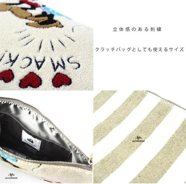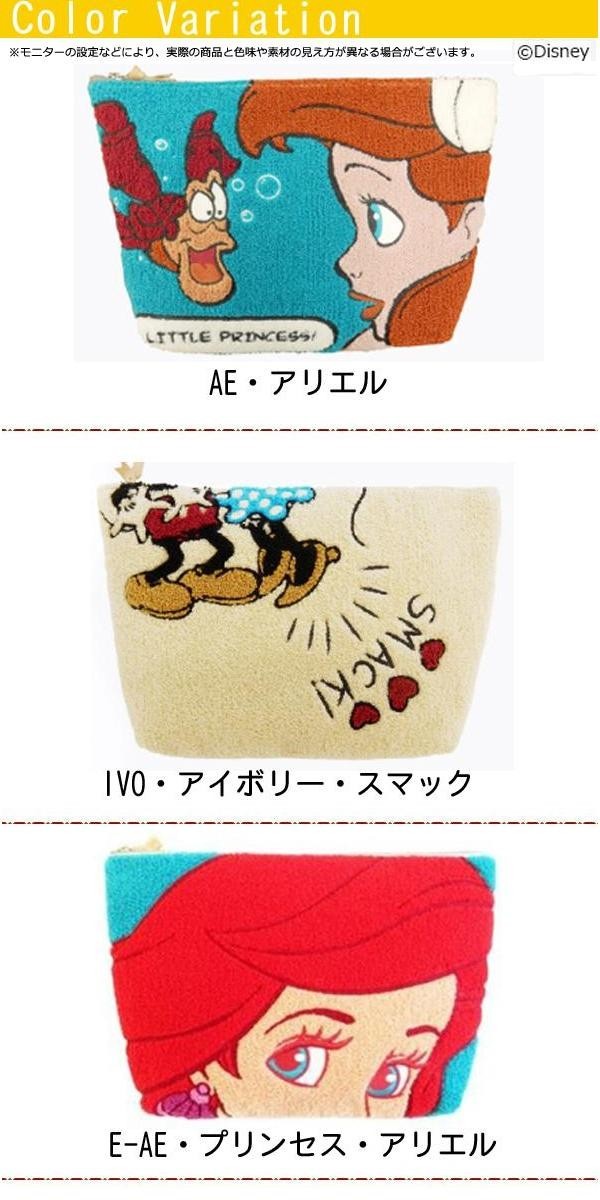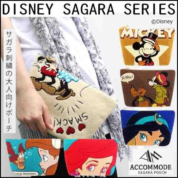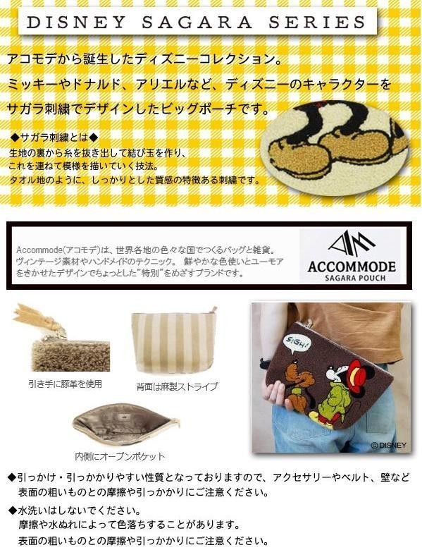 ディズニーのキャラクターをデザインしたビッグポーチ。表はボリュームあるサガラ刺繍で、裏面は麻製のストライプ柄。引き手に豚革を使用しています。大きめサイズなので、ポーチとしてはもちろん、クラッチバッグとしてもオススメ♪ |