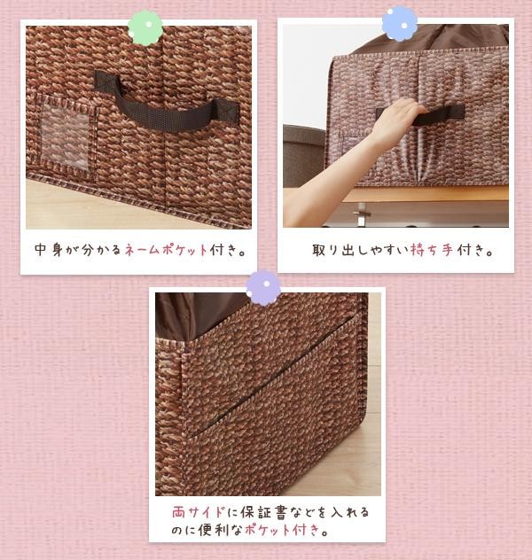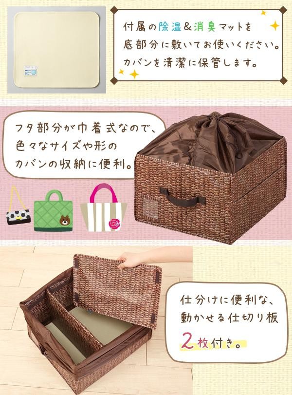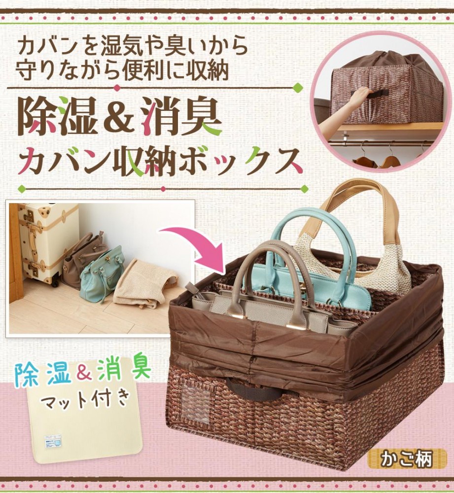 | 付属の除湿&消臭マットでカバンを清潔に保管します。フタ部分は巾着なので、色々なサイズや形のカバンに対応♪仕分けに便利な仕切り板2枚付き。中身が分かるネームポケット、両サイドに保証書などを入れるのに便利なポケット付き♪コンパクトに折り畳めるので、使わない時も場所をとりません!! |