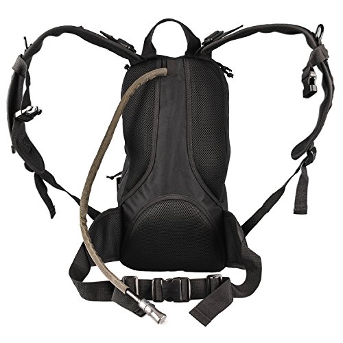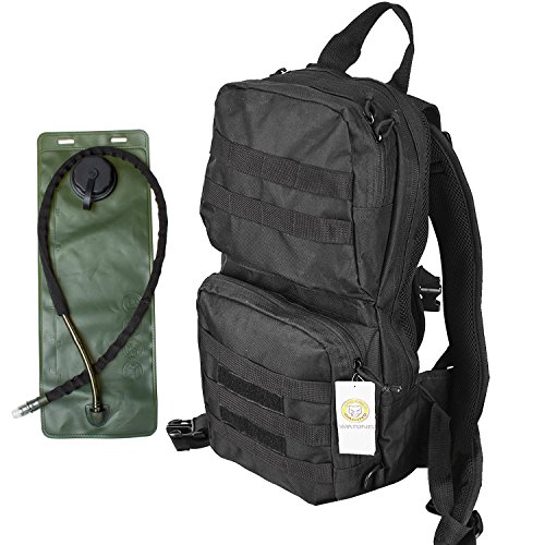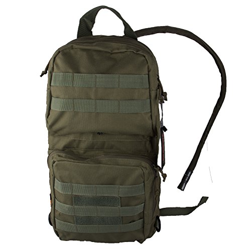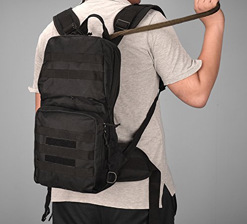Product Description New hydration backpack with 3L water bladder included. Features 2 front pockets in addition to water bladder compartment. Made from tough 600D nylon. Additional Molle webbing makes this little hydration pack even more versatile. Bladder holds 3L and features a Big Mouth opening and a matching covered sleeve for the drinking tube. BPA free. 0