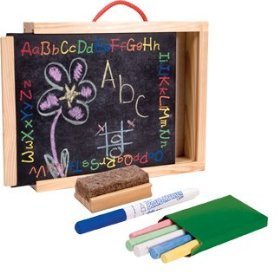 The best of both worlds! One side is a dry erase board and the other a chalkboard! includes box of colored chalk, a dry erase marker, eraser, and a sliding lid so all the supplies and drawings can be stored inside! Perfect for traveling in the car!Feature
