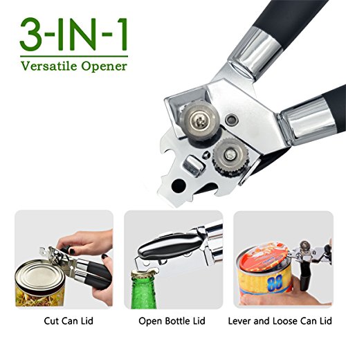 Manual Can Opener , Masatow 3-in-1 Professional FDA Approved Heavy Duty Stainless-Steel Blades with Non-slip Handle & Safety Smooth Edge & Hanging Holes for Can Open & Bottle Open & Tin Open