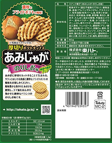原材料:乾燥ポテト(遺伝子組換えでない)、植物油脂、食塩(アルペンザルツ2%)、デキストリン、粉末油脂(粉末パーム油、粉末ごま油)、あおさ、粉末醤油、砂糖、麦芽糖、青のり、唐辛子、たんぱく加水分解物、牛脂加工パウダー、昆布パウダー、乳糖、かつお節パウダー、いわし煮干パウダー、宗田節パウダー、加工澱粉、トレハロース、調味料(アミノ酸等)、増粘剤(カードラン)、炭酸Ca、香料、甘味料(スクラロース、カンゾウ、ステビア)、酸味料、酸化防止剤(ビタミンE)、(原材料の一部に小麦、えび、かに、ごま、鶏肉、豚肉を含む)