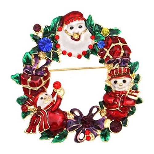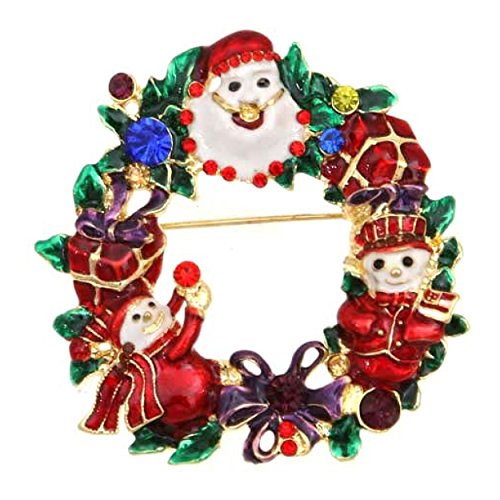 Red Green Cobalt Blue Enameled Crystal Snowman Santa Wreath Christmas Pin Brooch