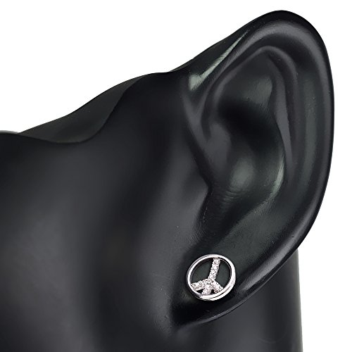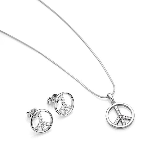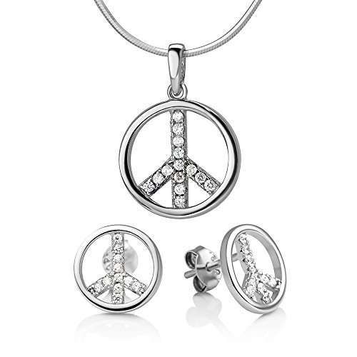 This beautiful earrings and necklace Peace sign jewelry set would be a wonderful addition to any wardrobe. The included black velvet pouch makes it the perfect gift for someone special. Made from high quality .925 sterling silver and beautiful Cubic Zirconia CZ synthetic paving stone. Came with 18" 925 Italian sterling silver snake chain. Light weight, classic design and beatufiul to wear in any occasion.