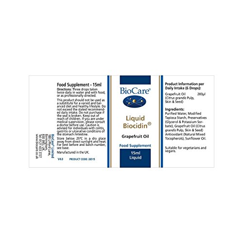 Studio : Biocare Publisher : Biocare Binding : Health and Beauty Product Description A liquid form of Biocidin providing concentrated grapefruit seed extract. this is best suited to those who have difficulties with tablets and capsules, children, the elderly and is safe for use during pregnancy.Provides a concentrated liquid source of grapefruit seed extract.Liquid format is ideal for those who are unable or prefer not to swallow capsules or tablets.If diluted, it can be used as a mouthwash, throat gargle or vaginal douche.The active grapefruit oil is derived from the seeds, pulp and white membranes of the grapefruit.Higher strength encapsulated grapefruit oil extracts Biocidin and Biocidin Forte are also available.Product Information per Daily Intake:IngredientAmountProviding% EC RDAGrapefruit Oil (Citrus grandis)200mcl(Skin, Pulp and Seed) Ingredients:Purified water, Modified Tapioca Starch, Preservatives (Glycerol Potassium Sorbate), Grapefruit Oil (Citrus grandis Pulp, Skin Seed), Antioxidant (Natural Mixed Tocopherols), Sunflower Oil.Recommended Intake:Three drops twice daily in water with food, or as professionally directed.Warnings: Caution is advised for individuals with colitis, gastritis or ulcerative conditions of the stomach/intestine. If you are under medical supervision, please consult a doctor before use This product should not be used as a substitute for a varied and balanced diet and healthy lifestyle. Do not exceed the stated recommended daily intake. Do not purchase if the seal is broken. Keep out of reach of children. Store below 25oC in a dry place away from direct sunlight and heat. 0