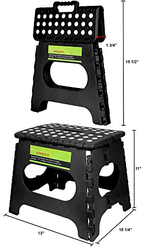 -. Feature : Amazing Product - Greenco super strong folding step stool is made for children and adults and can carry up to 300 pound!!! Dimensions: 11 W x 8.5 L x 11 inches H. / User Friendly - Especially designed to be fold in order to conserve space. Simply pull up the handle and push in the sides and you are all set. / EZ Carrying - Greenco Foldabe step stool has a durable Carrying Handle. This remarkable feature allows you to carry the step stool wherever you go. / Greenco Foldable Step Stool gives you and your children the extra height you need, weather it is in the kitchen, bathroom, dining room or at the go. / Awesome Feature - After deeply considering the needs of our customers, we came up with a brilliant idea. We installed rubber Polka Dots on the step stool's surface in order to prevent injuries which occur from slipping. In addition, not only it will give you the grip you need, it's also looks great and stylish.