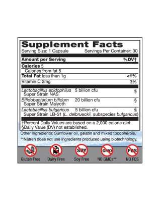 Each non-dairy probiotic capsule contains a minimum of 30 billion colony forming units (cfu) of three potent, super strains of beneficial bacteria.