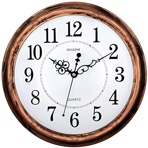 -. Title : Adalene Non-Ticking Wall Clock Large Decorative - 13-Inch Living Room Silent Wall Clock - Quiet Battery Operated Quartz Analog Movement, Bronze, Round, White Dial, Arabic Numerals, Outdoor