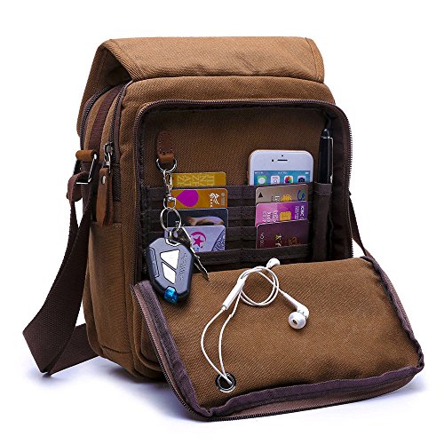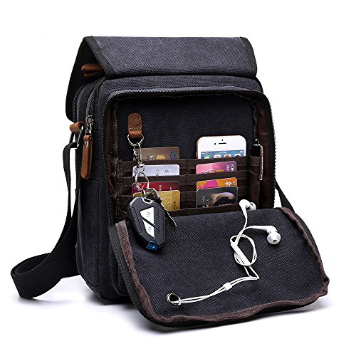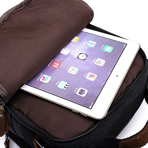 -. Feature : Durable Material: High density cotton canvas and genuine leather zips / Suitable Dimensions: 10" L x 11" H x 5"W, small capacity but perfectly fits up to 10" Tablet, iPad, Kindle / Great Structure: A total of 9 pockets (7 zipped pockets, 2 external side pockets without zipper), 8 credit card slots, a pen slot, a neat little holeand a ring for a key chain / Awesome Design: The flap is held closed by a Velcro(cross-stitching, more durable), adjustable shoulder strap, a strong handle at the top so you can use it whenever you want / LIFETIME WARRANTY:Buy with confidence, we stick by our products and customers not matter what. Our outstanding support team is only a message away