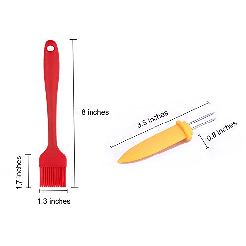 5:→CORN HOLDERS & SILICONE BRUSH. KEEP FINGERS SAFELY away from hot corn with soft grip ergonomic handles and stainless steel pins. Actually they are not only a good partner with corn, but also fruits, meat or other food. SILICONE BRUSH: Heat-resistant and easy to clean. It has 4 rows of 13 bristles each for a total of 52 bristles .Made of FDA silicone with a steel core inside and BPA free .