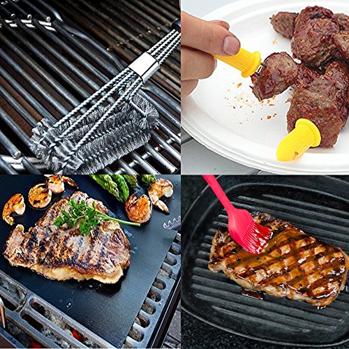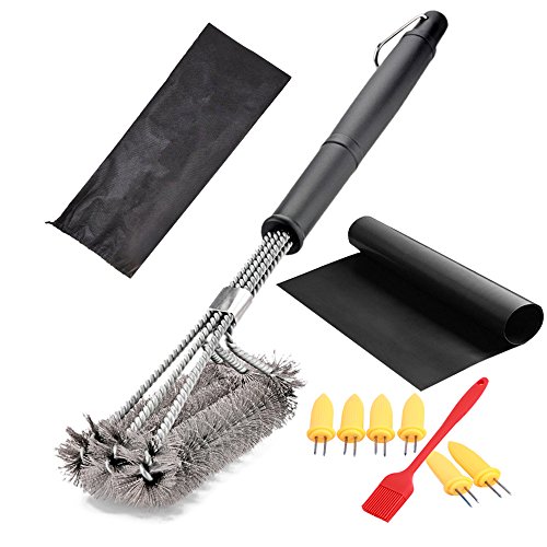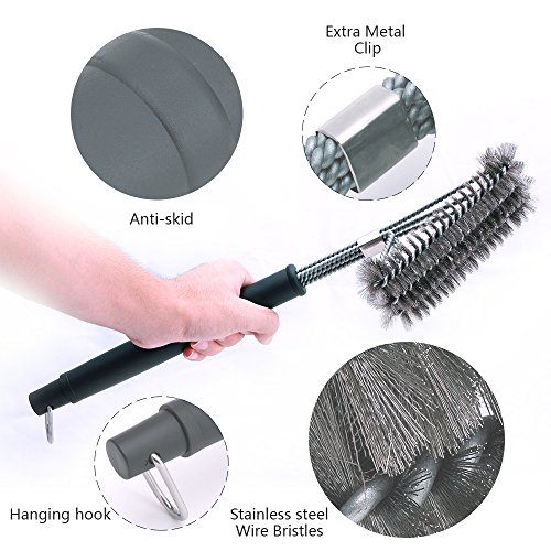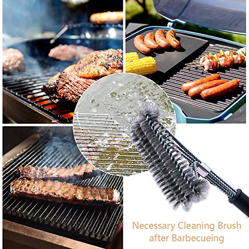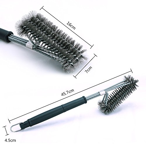 1:→GRILL BRUSH: 3 IN ONE BBQ CLEANING BRUSH. Easy and fast to clean, large enough to clean the Top, Bottom, and Sides of all Grill Grates. Cleans the upper wire rack area as well, meanwhile, which make the cleaning job more effective.