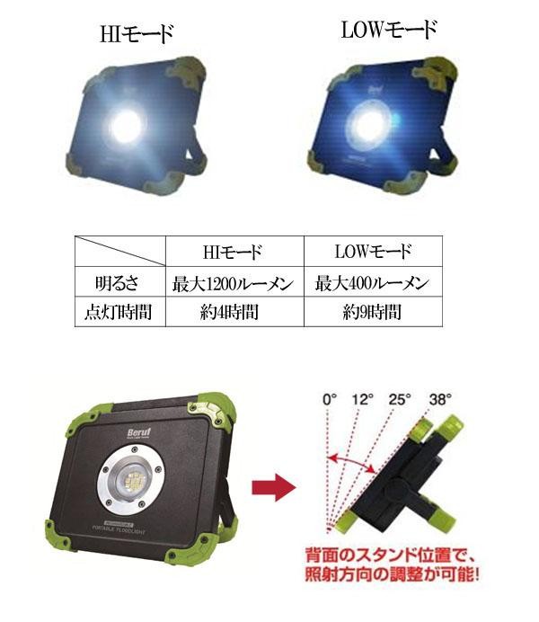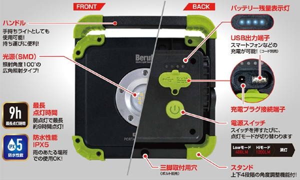 | 充電式で使用場所を選ばず、持ち運びにも便利な充電式ポータブル投光器です。背面のスタンドで上下4段階の角度調整も可能。弱点灯で最大9時間点灯します。 |