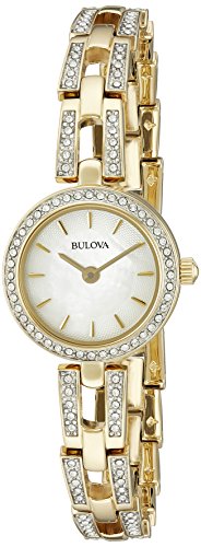 Stainless steel face. Silver and gold-tone stainless steel bracelet features crystal accents and a jewelry clasp closure. Mother of pearl dial features silver-tone hour markers and hands, crystal accents, and Bulova detailing. Crystal-embellished bezel. Water resistant 3 ATM/ 30 meters. Imported.Feature
