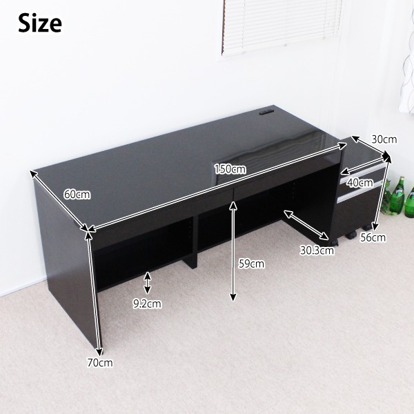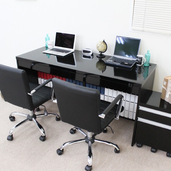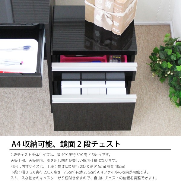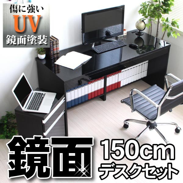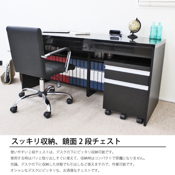 ブラック鏡面!150cmデスク+2段チェスト