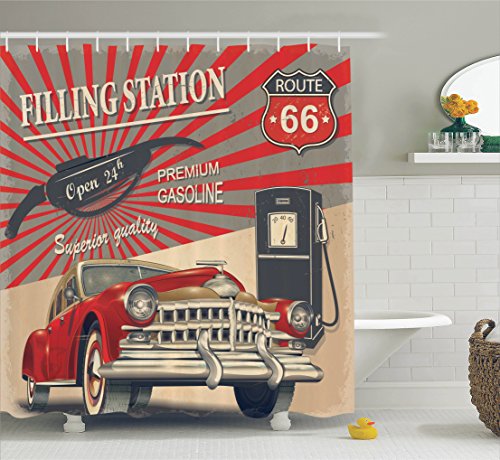 Old Cars Decor by Ambesonne, Poster Style Image of Gasoline Station Commercial with Kitschy Elements Route 66 Theme Graphic, Polyester Fabric Bathroom Shower Curtain Set with Hooks, Vermilion Beige