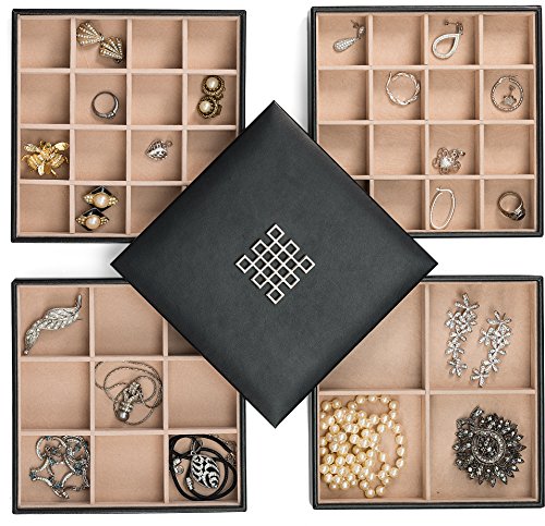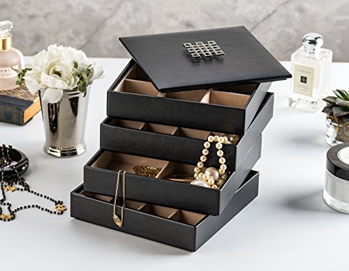 Glenor Co Earring Organizer Tray - 4 Stackable Trays with Lid -45 Slot Classic Jewelry Storage Display Case for Drawer or Dresser - Holder for Earring Ring Necklace or Cufflinks - Large Mirror - Black