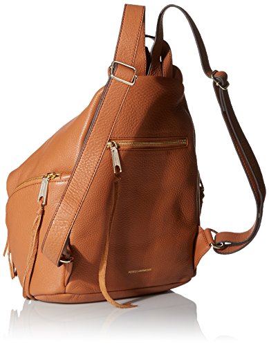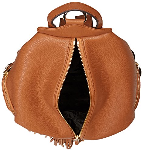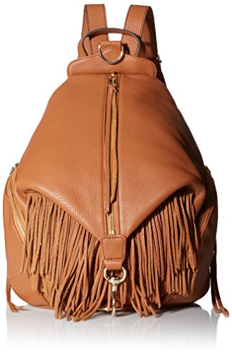 A pebbled leather Rebecca Minkoff backpack, updated with swingy fringe. Zips accent the curved side pockets, and a spring lock punctuates the horizontal front zip. The lined interior houses 3 notch pockets and a zip compartment. Adjustable shoulder straps and locker loop.