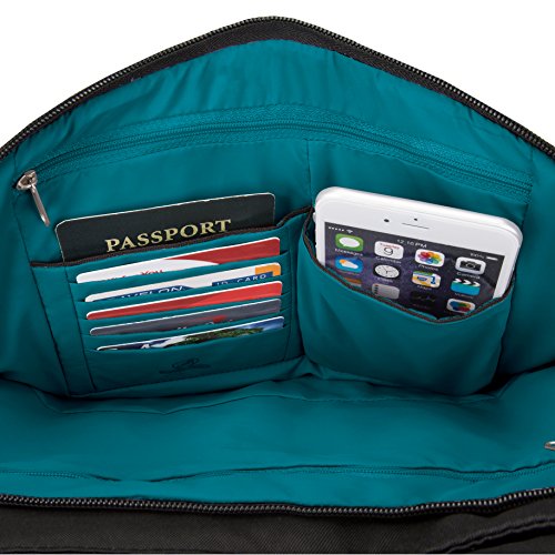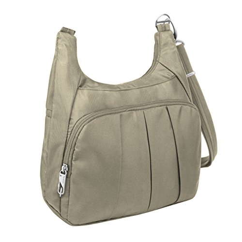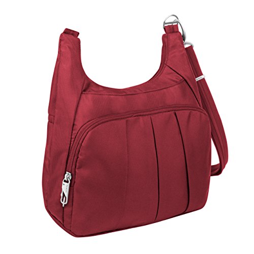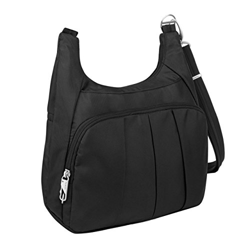 The Travelon Anti-Theft Classic Pleated Front Hobo combines style and function in an attractive security-conscious bag. Security never looked so good. The adjustable strap allows you to wear over the shoulder or as a crossbody bag. It can easily hold an iPad or tablet. The front compartment has a zip pocket plus an organizer with RFID blocking card and passport slots. The slash-resistant strap can be attached to a stationary object to prevent a grab-n-go. The front and rear slash pockets are perfect for frequently needed items. Two mesh expansion pockets are ideal for a water bottle, umbrella or sunglasses. Comes in Black, Purple, Cranberry, Midnight or Stone.Feature