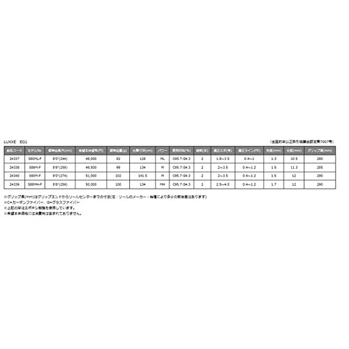 가마가츠 러그《제》 EG1 S90M-F■표준 전장(ft/cm):9.0(274)■표준 자중(g):102■끝치수(cm):141.5■파워:M■사용 재료(%):C95.7:G4.3■계수(책):2■적정 에기(호):2~3.5■적정 라인(PE):0.4~1.2■처(먼저)경(mm):1.5■원지름(mm):12■그립장(mm):290